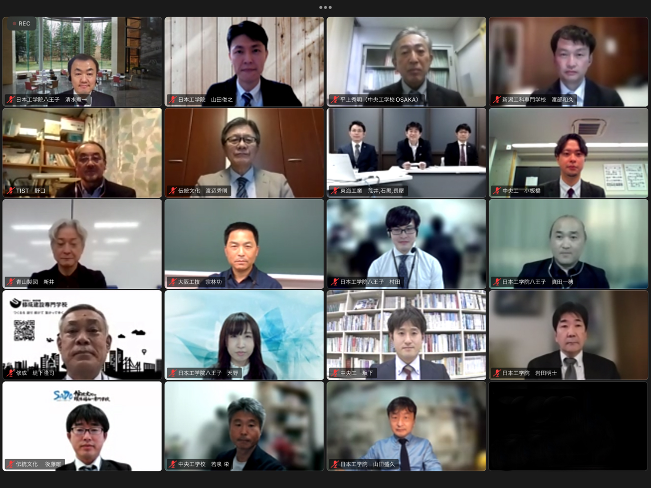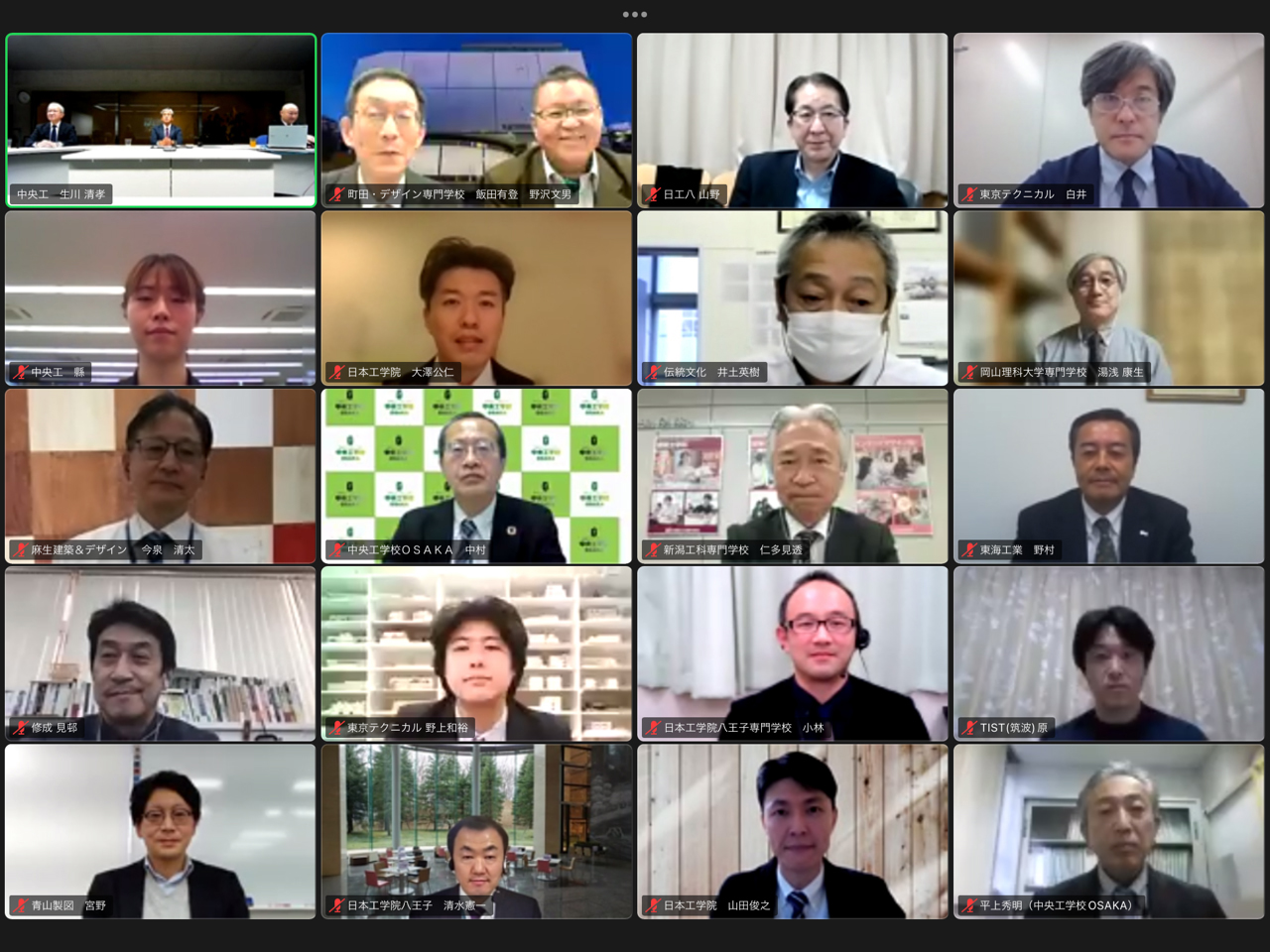 2.参加校: | 参加会員校:計15校(44名) 筑波研究学園専門学校/中央工学校/青山製図専門学校/ 専門学校東京テクニカルカレッジ/町田・デザイン専門学校/ 日本工学院専門学校/日本工学院八王子専門学校/ 新潟工科専門学校/伝統文化と環境福祉の専門学校/ 東海工業専門学校金山校/大阪工業技術専門学校/ 修成建設専門学校/中央工学校OSAKA/岡山理科大学専門学校/ 麻生建築&デザイン専門学校 (※順不同) |